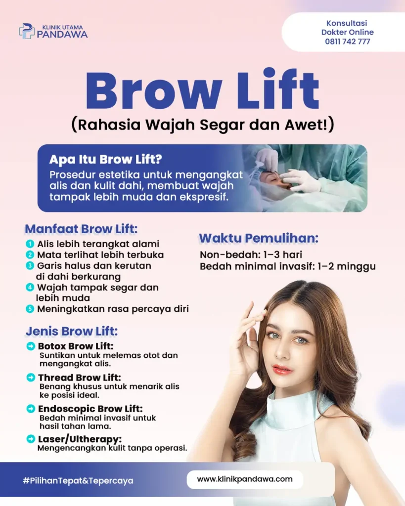 Ingin wajah terlihat lebih segar dan ekspresif tanpa harus repot dengan perawatan rumit? Saatnya mencoba brow lift di Klinik Utama Pandawa! Dengan teknologi modern dan dokter profesional, perawatan ini mampu mengangkat alis, memperhalus garis dahi, dan membuat mata tampak lebih terbuka sehingga wajahmu terlihat lebih muda dan segar secara alami.