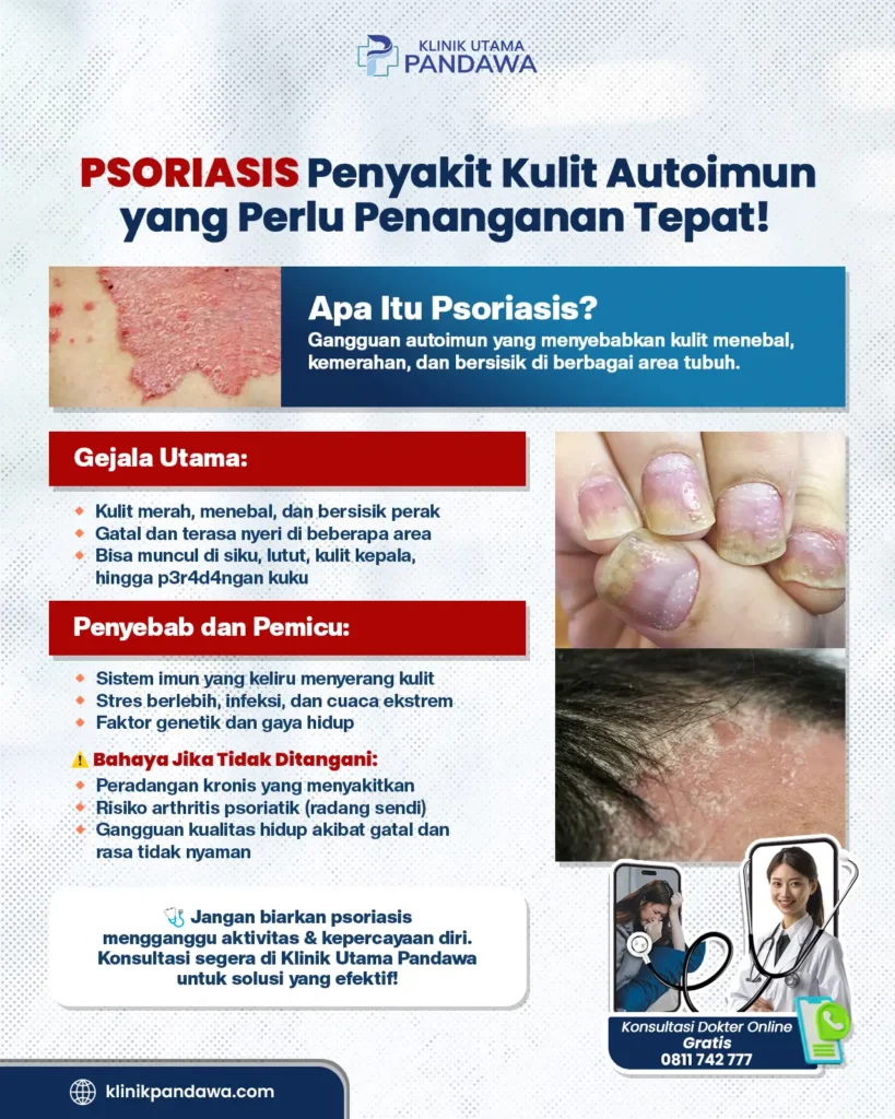 Jika Anda atau orang terdekat mengalami gejala psoriasis eritroderma, jangan biarkan kondisi ini mengganggu kualitas hidup Anda. Klinik Utama Pandawa siap memberikan perawatan medis terbaik untuk mengatasi peradangan kulit yang parah, gatal, dan pengelupasan yang mengganggu. Dengan dukungan tim medis yang berpengalaman dan teknologi terbaru, kami akan membantu Anda mendapatkan perawatan yang tepat dan efektif untuk mengelola psoriasis eritroderma dengan aman.